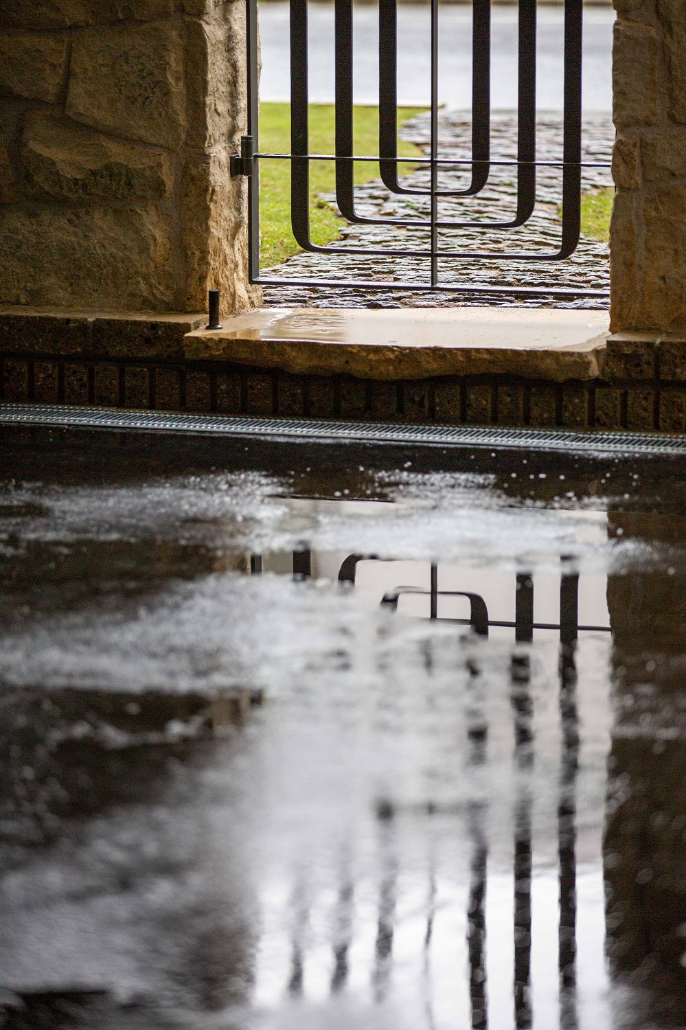 病院のエントランスに生まれたお庭は、涼しげな木立の中に石積みと創作ロートアイアンの扉が印象的で、訪れた人の目を引く緑の空間となりました。