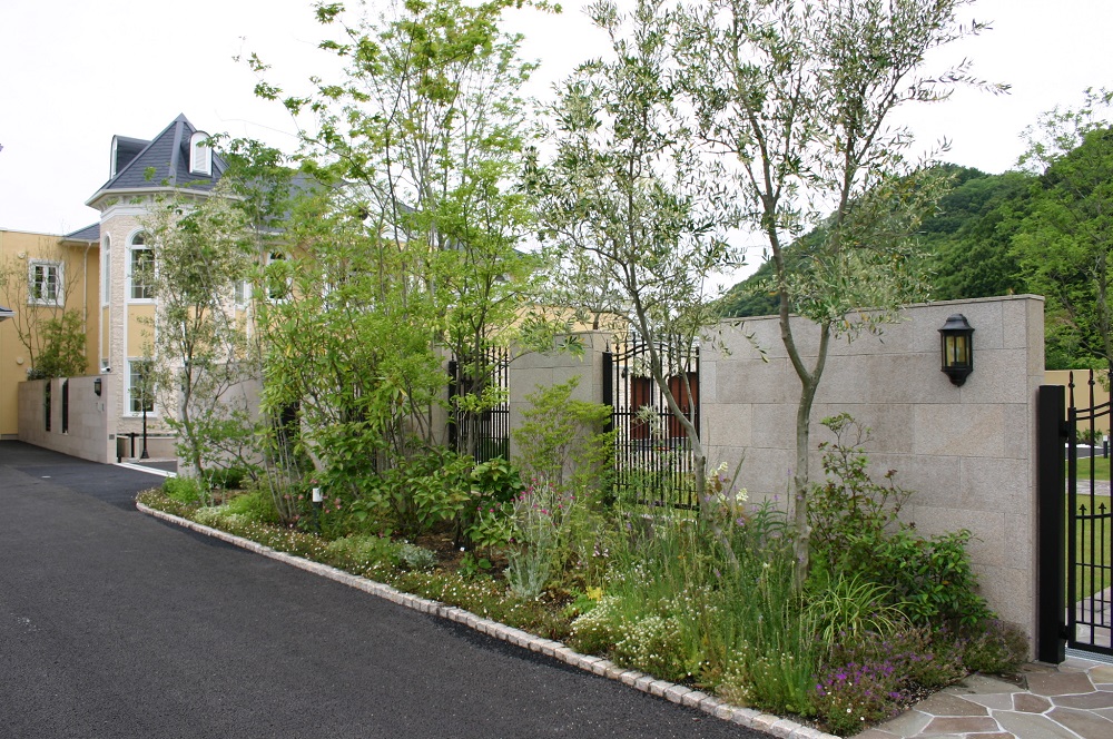 海に近く樹種選びは時間がかかりましたが、オリーブ、サルスベリなどを中心に思う形の植木を選んでいきました。庭園内にはがガゼボやテラス、ファニチャーもあり、ゆったりとした気分で散策を楽しむことができます。