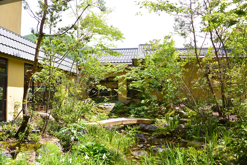 エントランスや喫茶室から眺める庭には季節の山野草があちこちに咲き、
