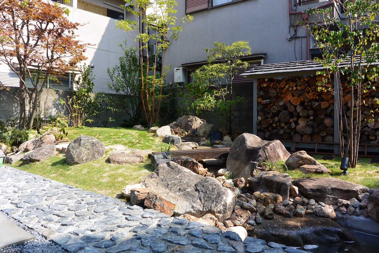 流れには既存の石を組み直し、ゴロタ石を敷くことで自然な小川を造りました。