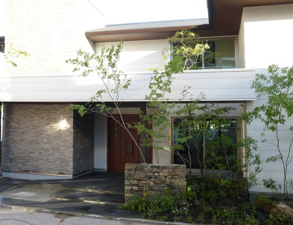 深い表情と温かみのある木造のお家。屋外とシームレスにつながる軒下の空間が心地よく庭を屋内に取り込みます。アプローチ前の門柱と、庭を囲むなだらかな自然石の層積が一連の流れをつくり、草花や植木をより一層美しく引き立てます。
