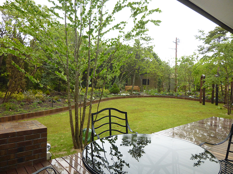 コニファーが大好きな施主様のご希望でメインガーデンに様々な種類のコニファーを植えました。既存の国有林をバックに、美しいイングリッシュガーデンが広がります