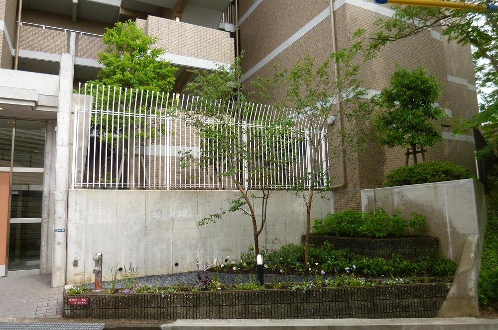 どうしても目立ってしまう既存のリブブロックは、将来的に隠れるように低木の常緑を密植。