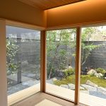 和室の縁側から勝手口へは木曽石を敷いて園路とし、落ち着いた動線に仕上げました。