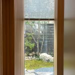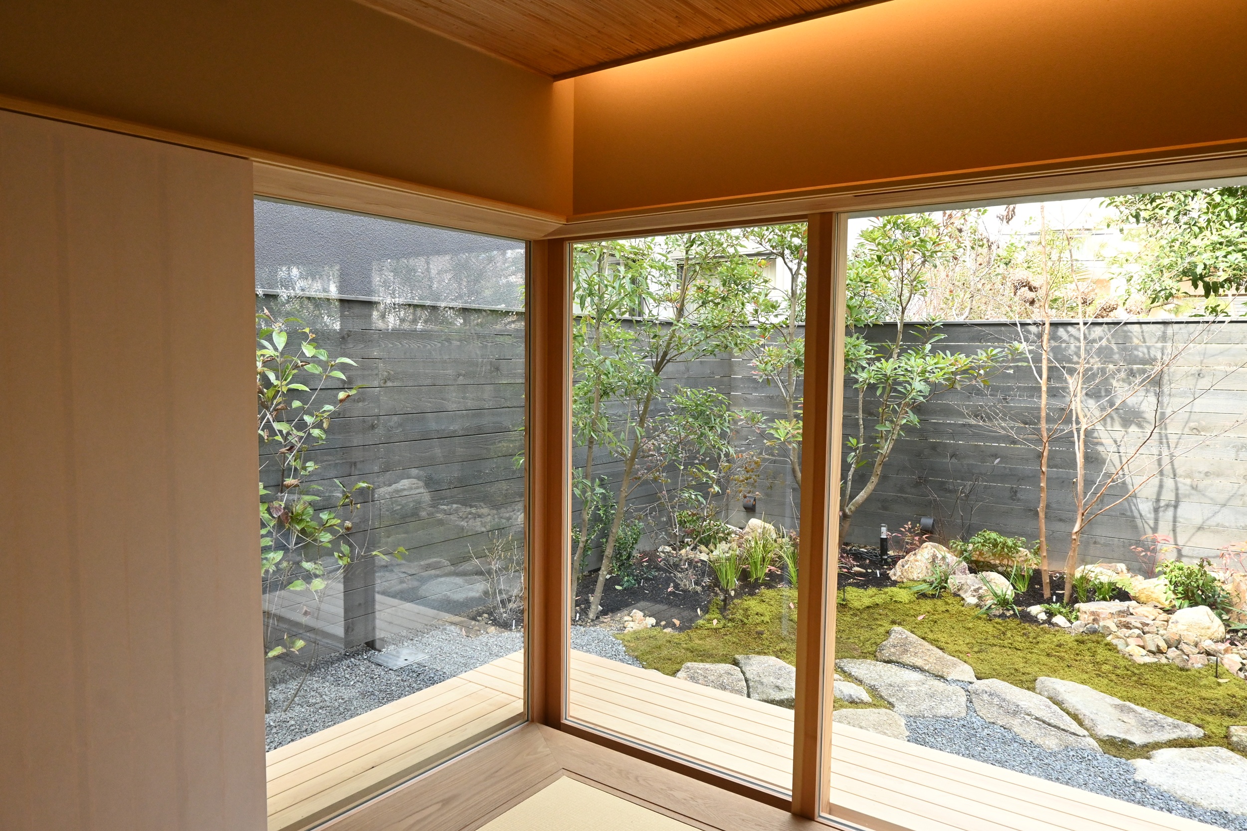 北側の庭は板塀で囲われ、砂利と苔が静かな雰囲気をつくっています。