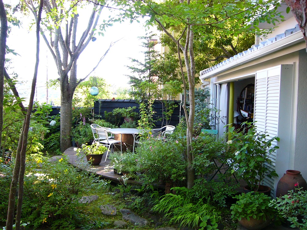庭を一望できる円形のウッドデッキや、全体を回遊できるようにつくったアイアンの太鼓橋、自然石 小端立ての園路、丹波石や枕木の階段などのさまざまな素材がお庭空間に変化を生んでいます。