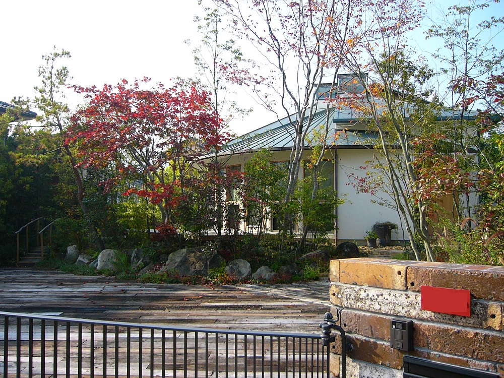 印象的な円形の美しい建物。周囲を包み込むように雑木を植えています。
