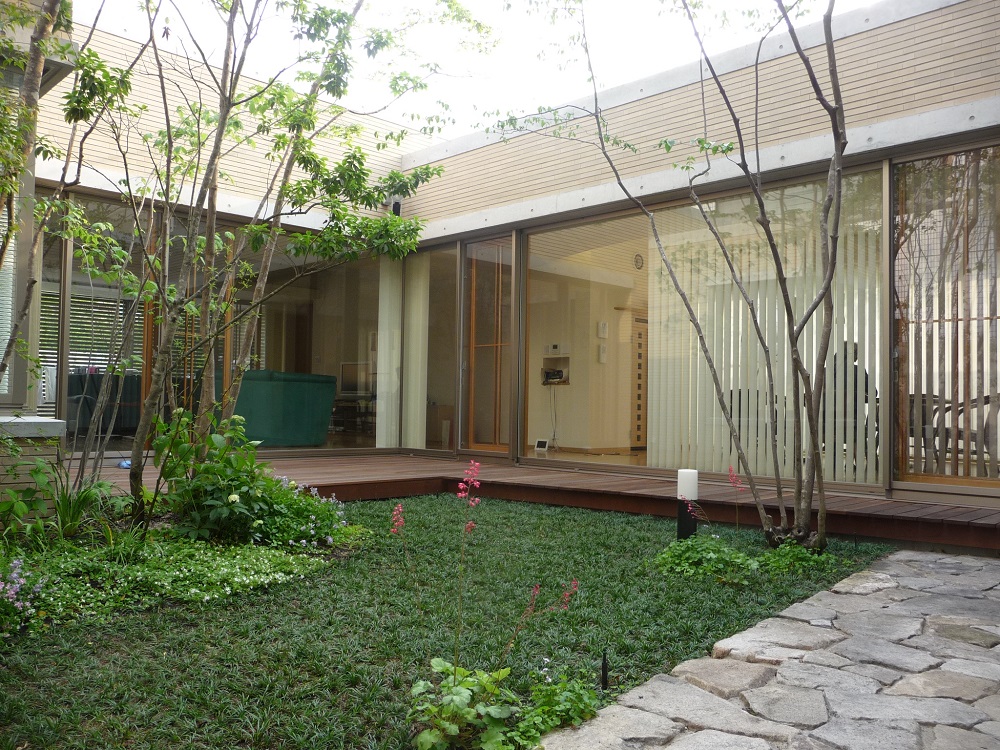 三方向の部屋に囲まれた広い中庭には幹のラインが美しいハウチワカエデ、ソヨゴ、ナナミノキなどを植えました。デッキや敷きつめた石に写し出される枝葉の影がより自然を感じさせてくれます。