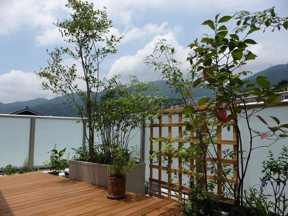 六甲山を背にした無機質なマンションにデッキの高さ制限や給排水をクリアーして自然の一角を造りました。奥行きが少ないので、お部屋からアオダモ、ガマズミ、ハイノキ、ハクサンボクなどの木々や