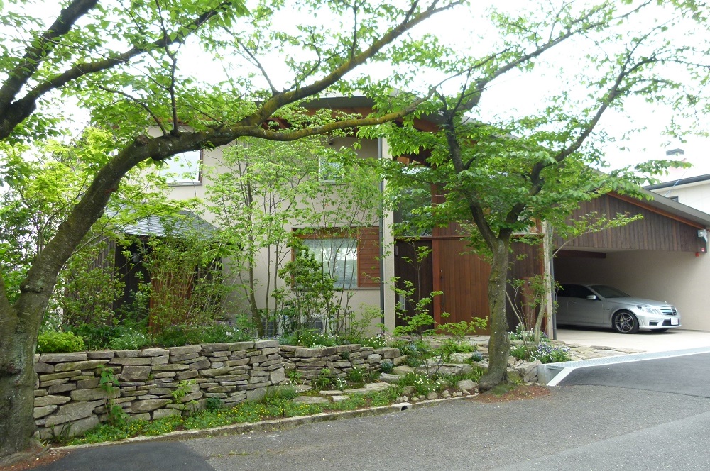 庭木と街路樹のサクラが絡み合いながら足元にはポテンチュラやエリゲロンデージー、山野草がやさしく風に揺れお客さまをお迎えします。