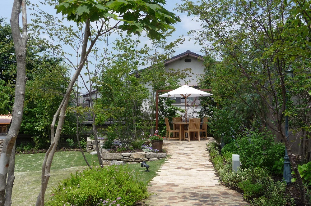 既存の板石やレンガ、樹木ももできる限り使用し、全く新しいお庭が誕生しました。