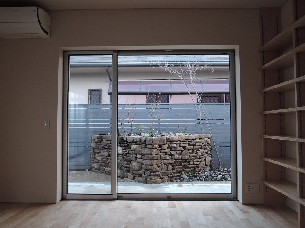 リビングに飛び込んでくる景色には、背が高めの石積みと円形の植栽枡にはオリーブを植栽。