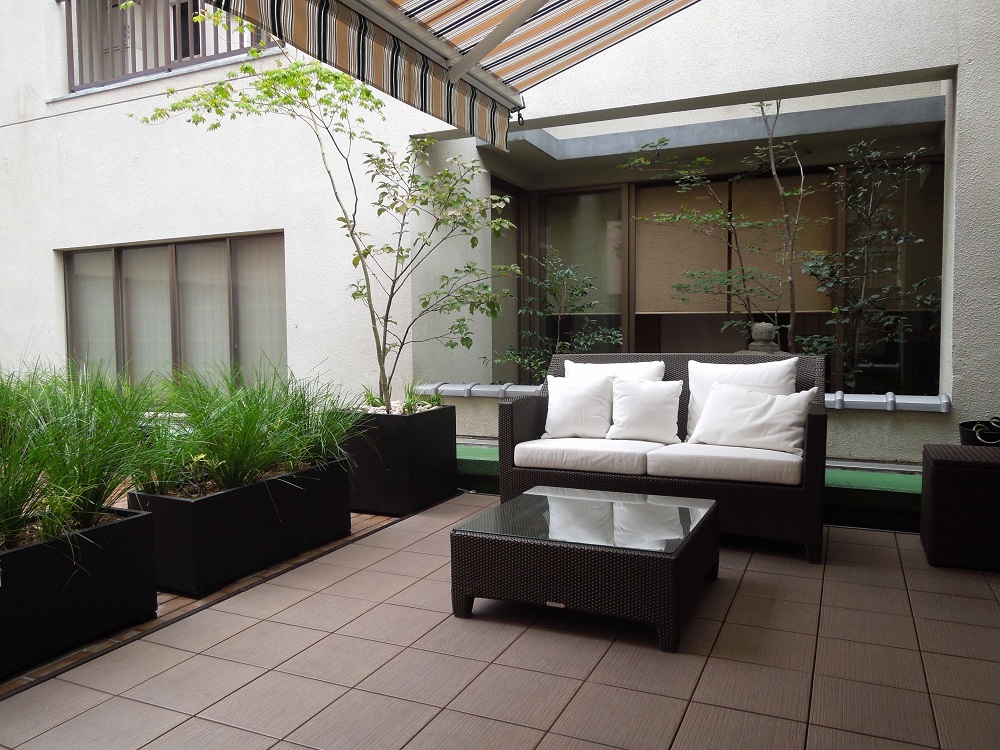 大阪市の中心地にあるビルの屋上ガーデンです。既存の和庭を活かしつつ、ずっと手つかずになっていた広いテラスを改修し新たな庭スペースとしました。