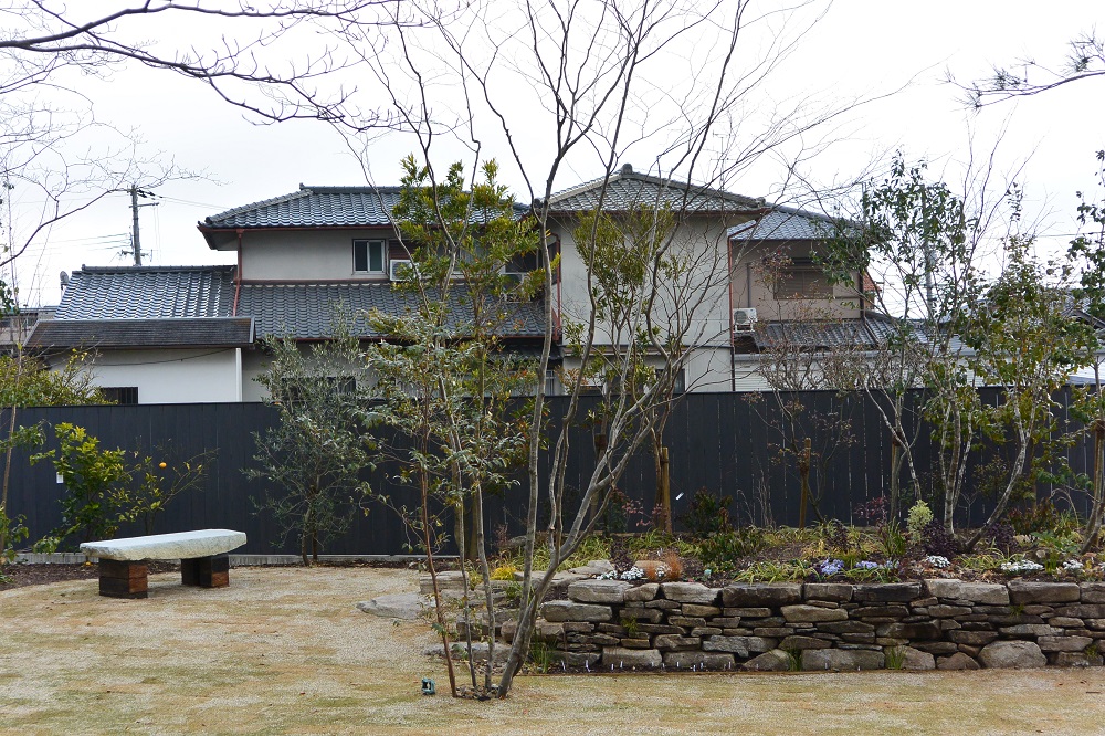 奥には丹波石の層積みが見え、石の力強さと植物の柔軟性とのバランスが、以前からあったかの様な自然の空間を造りだしています。お庭に出るとベンチが設けられており、座るとお庭を通して朱雀門と三笠山を望むことができるのです。