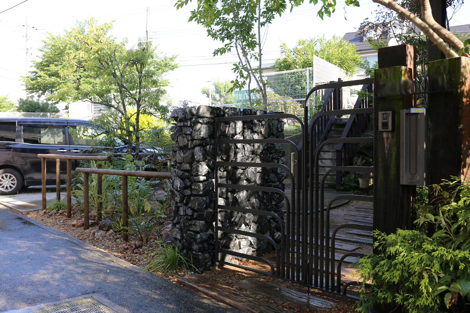 目をひく両開きのアイアンの扉は、手作業で製作されたもの。石積みと既存枕木の柱、植物の全てが以前からこの場所にあったかのように馴染んでいます。