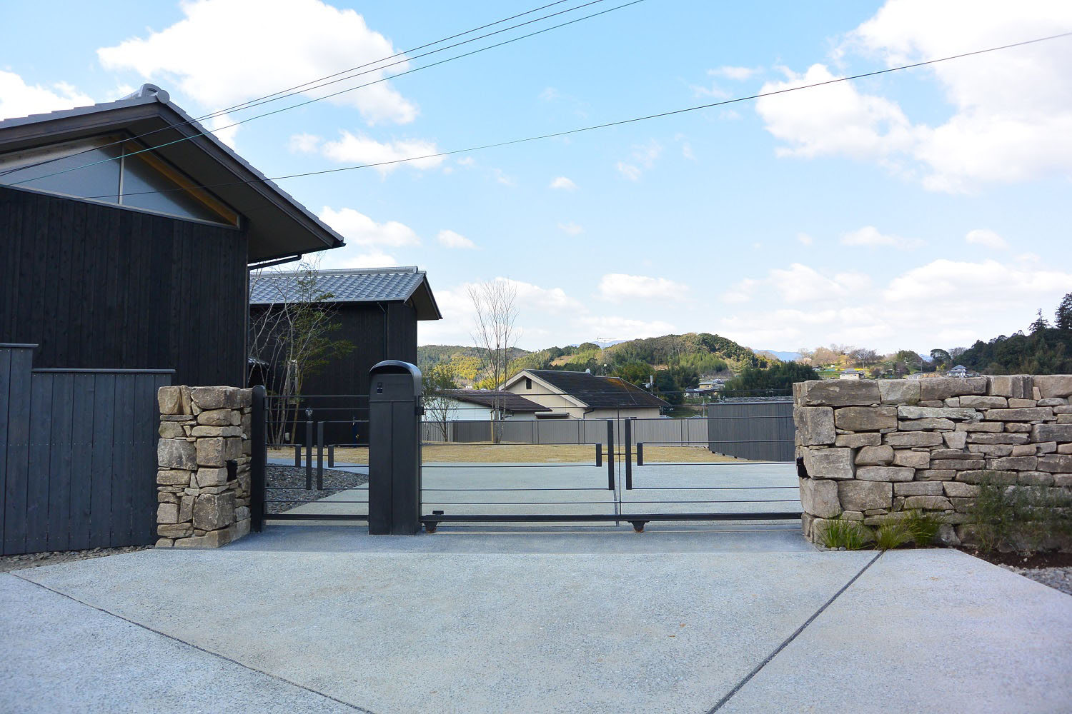 重厚感のある自然石の層積みと 創作アイアンの引き戸が特徴的な明日香の庭。平屋の家にすっきりとしたアプローチのラインが美しく映え、ガラスとアイアンの照明がアクセントとなっています。