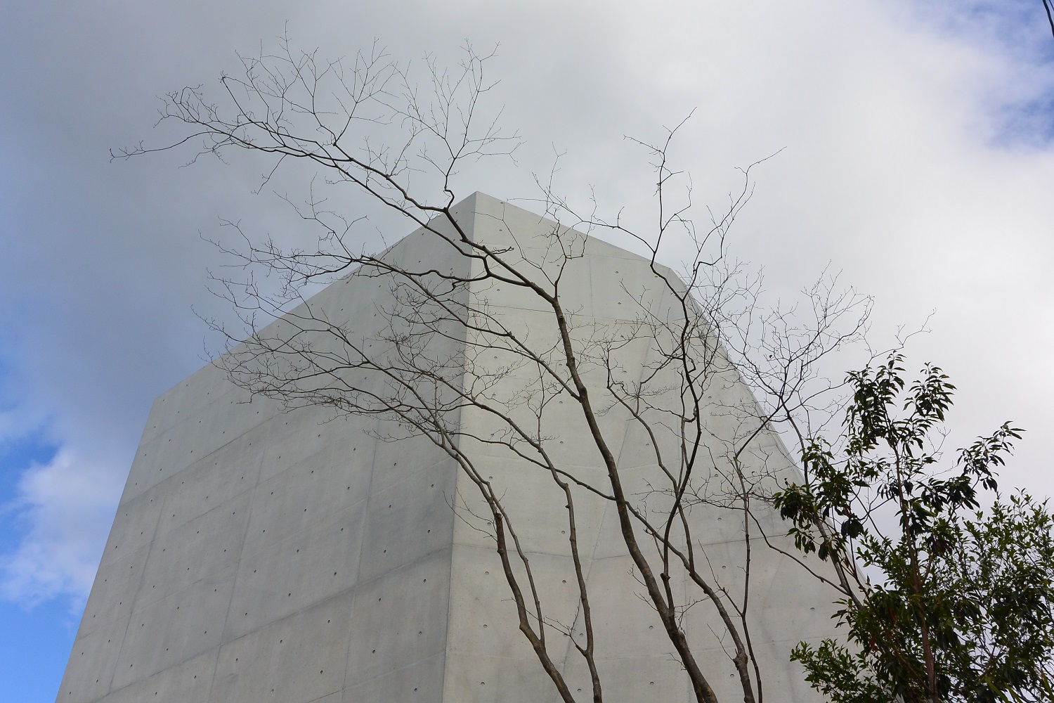 コンクリートの壁面が急角度でそびえる芸術性の高い建物に、緑の彩りで憩いの空間を造りました。大株のヤマボウシを両側に添わせ、繊細かつ柔らかさを融和し、足元にはアガベやチャート石を据え、南国系の暖かい雰囲気と色味を加えます。