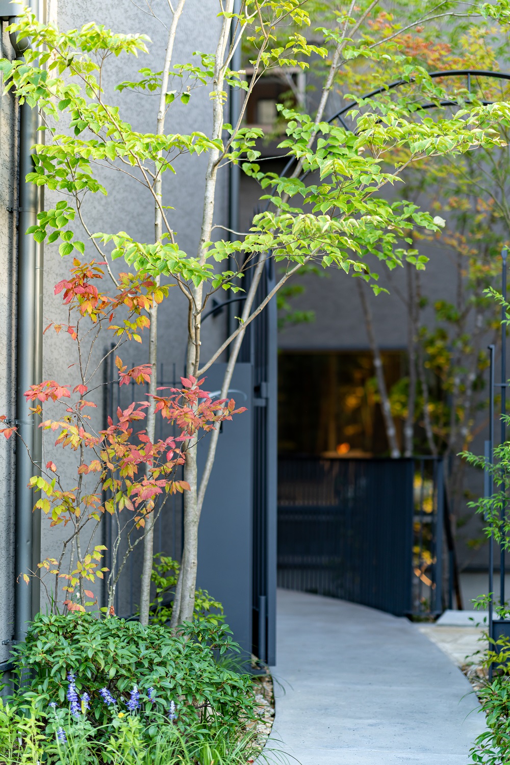 まず訪れる人を出迎える”マエニワ”はヤマボウシをメインに、ナツハゼやハウチワカエデを。アプローチを通ってアイアンの門扉へ向かい、浮橋へと繋がります。